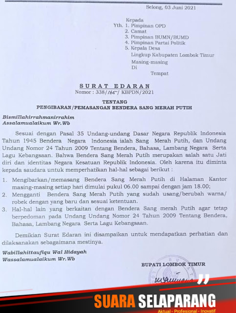 “Bendera sang merah putih merupakan salah satu jati diri dan identitas Negara Kesatuan Republik Indonesia (NKRI),” tulis Bupati dalam SE. (14/6/21)